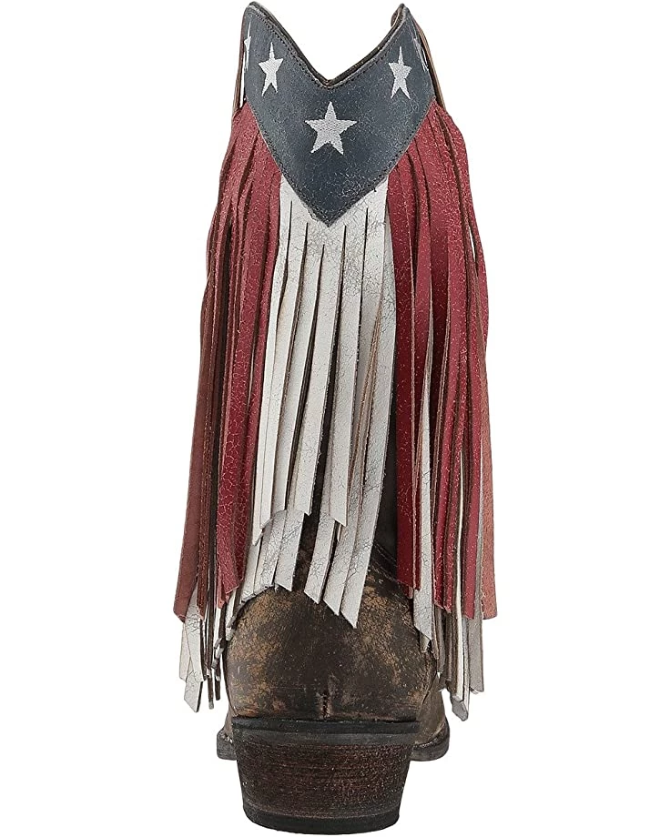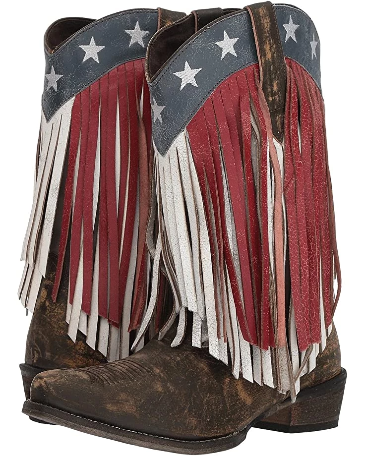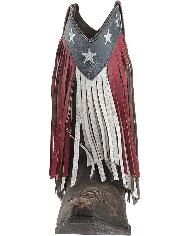 - Distressed full grain leather upper with beautiful leather fringe featuring the American Flag stars-and-stripes design.