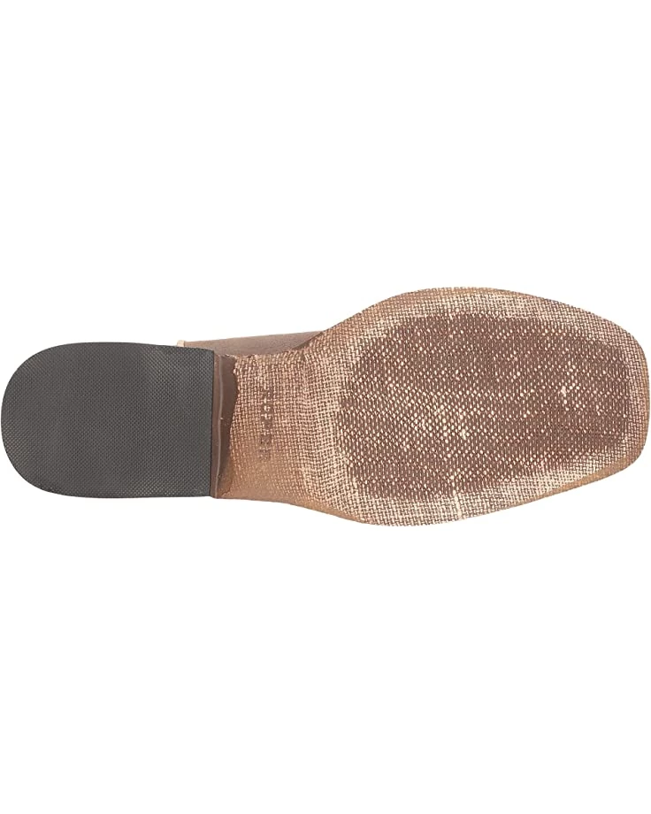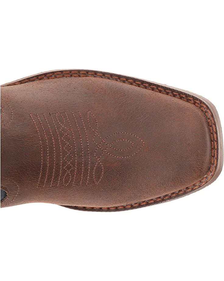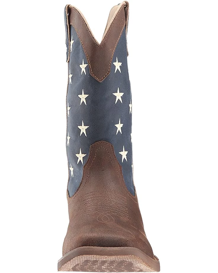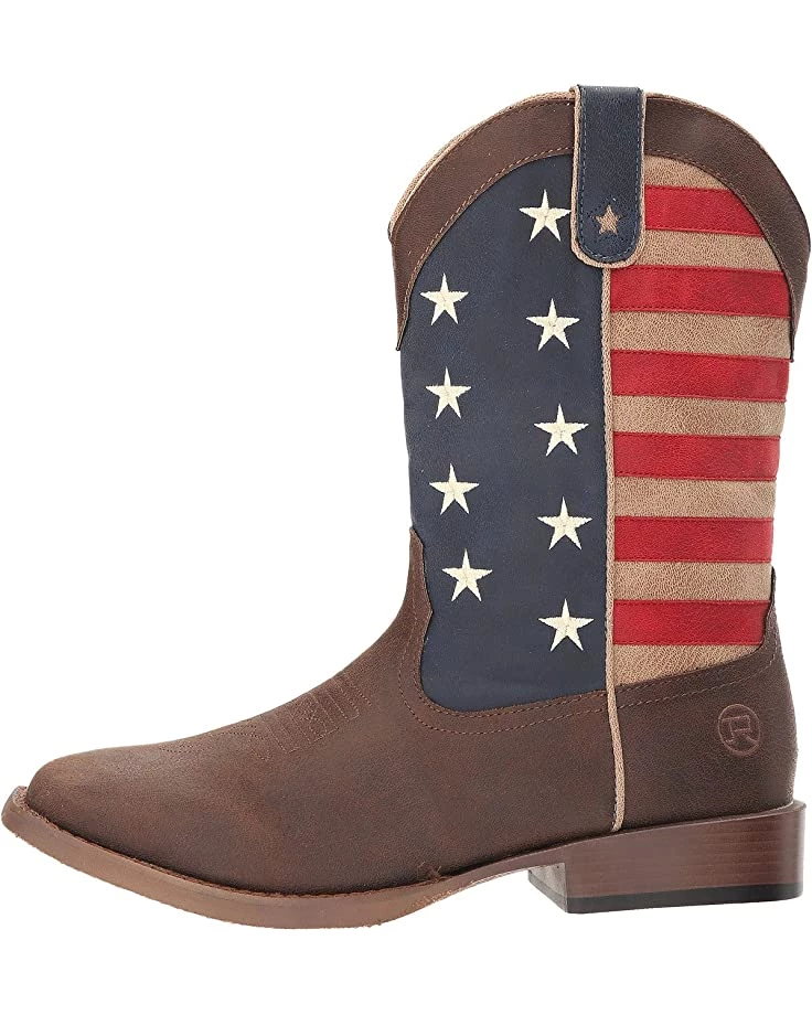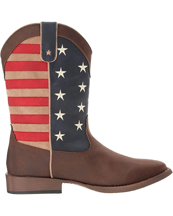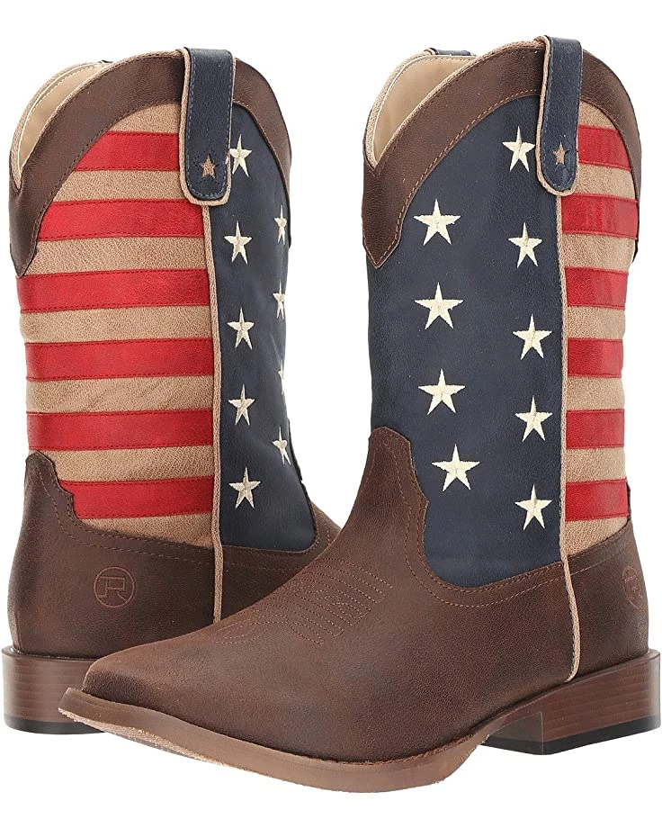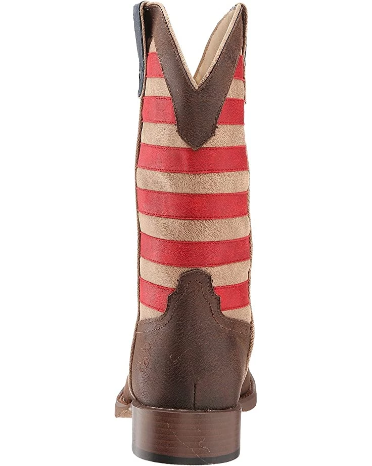 - Distressed leather upper with American Flag design of stars and stripes on shaft and a faux leather foot.