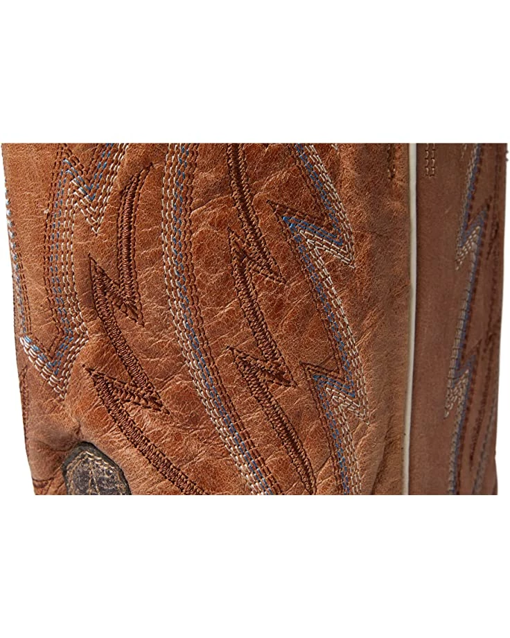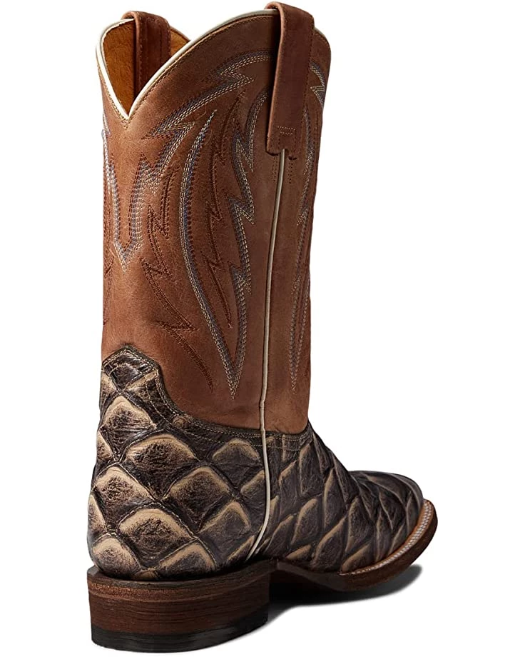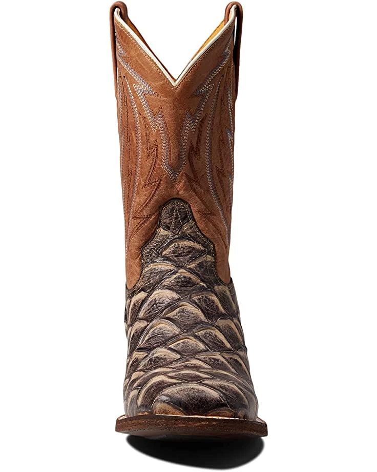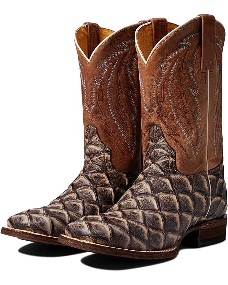 - Pull-on style Western boot made of full-grain leather upper with exotic pirarucu print on the foot.