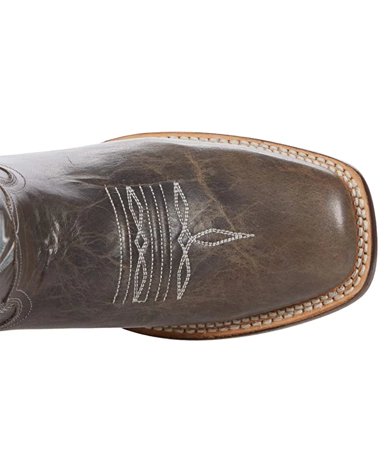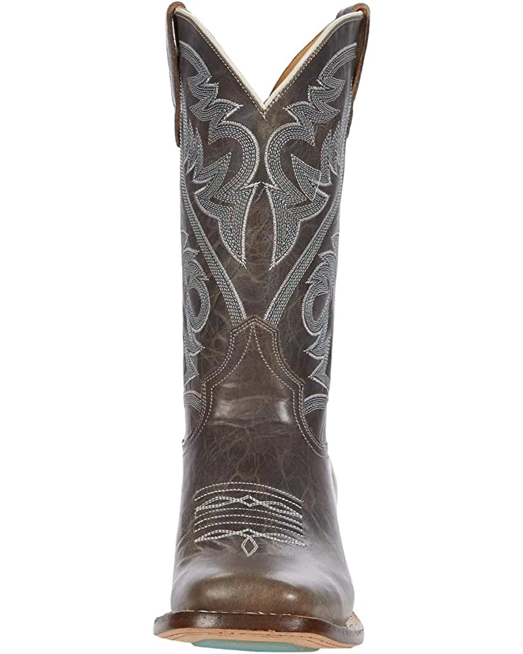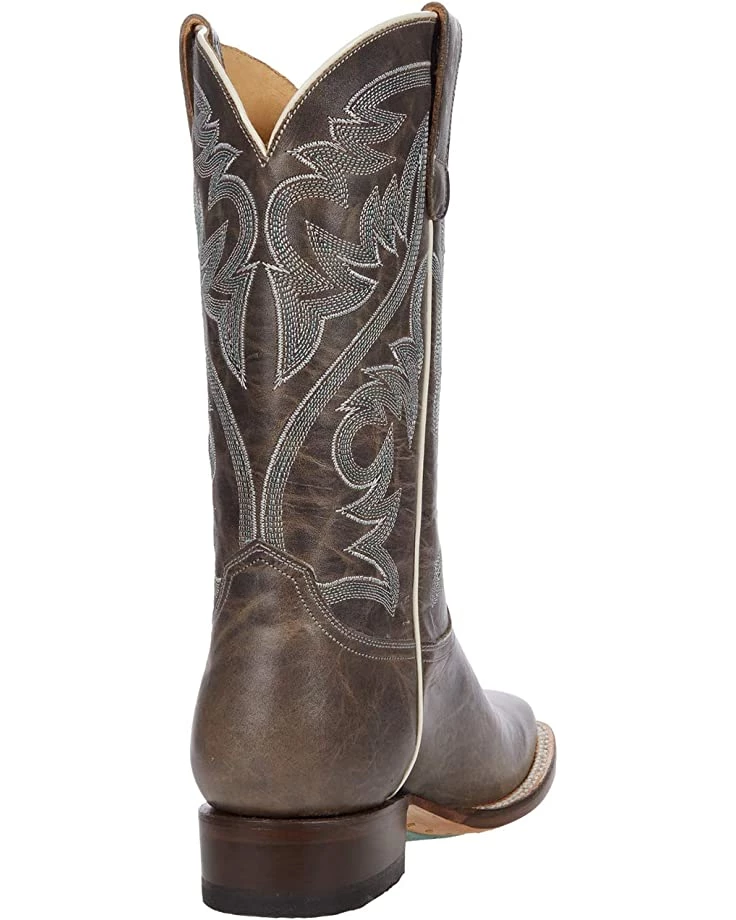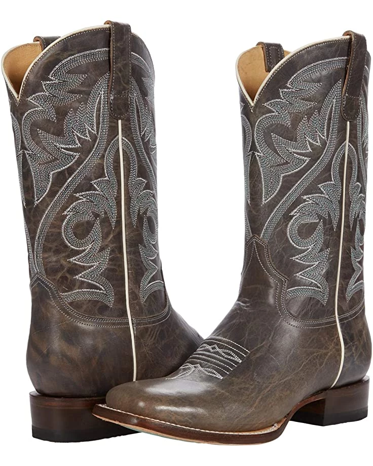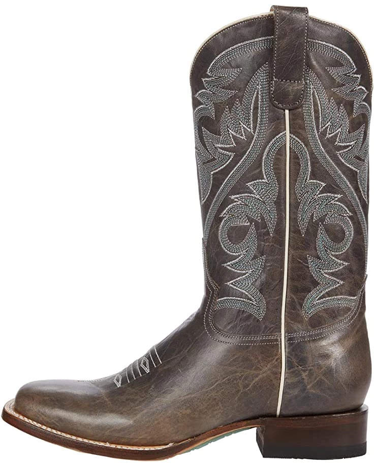 When I got these and tried them on, I found I had to put on nylon trouser socks, grab the pull tabs and pull up while forcing my heel into the boots at the same time, to get them on. Once on, they loosened up pretty soon. These are really nice boots and A+ for the distressed light grey color (not green like in the description) which is a nice change. I wear 8.5 and could fit the size 8 perfectly well, as soon as my foot was in them to loosen them up. The shaft height is actually 11.5″ and not 12″. These are very comfortable once they loosen up, with good arch support and foot cushioning. A very good quality, well made boot, with a leather lining, and real leather shaft, and hybrid leather/rubber sole. These seem durable, dependable and reliable, & like they would last. I was not nuts about the boxier square style as well, but the other qualities made up for that. Was hoping they were 12″ tall shaft, as some Roper boots have a 12″ shaft, but only with leather soles. As for why Roper makes 12″ tall shaft boots with leather soles only, and the boots with rubber on the soles are shorter, I have no idea! But hope they will make some like these with a taller shaft (12-13″) and rubber on the soles as well. Otherwise a good quality boot worth the money.