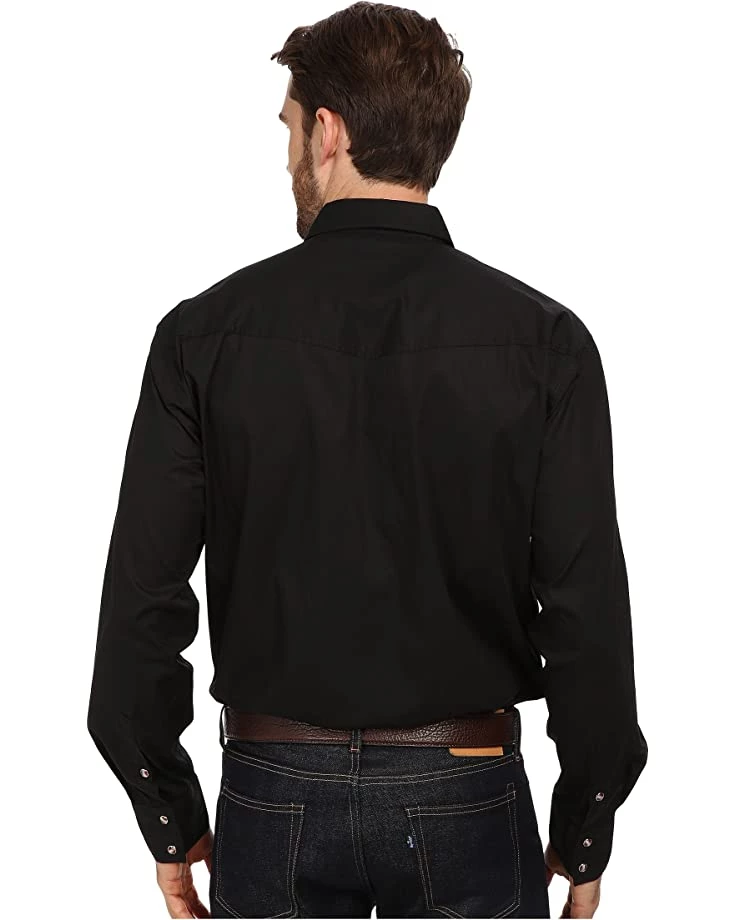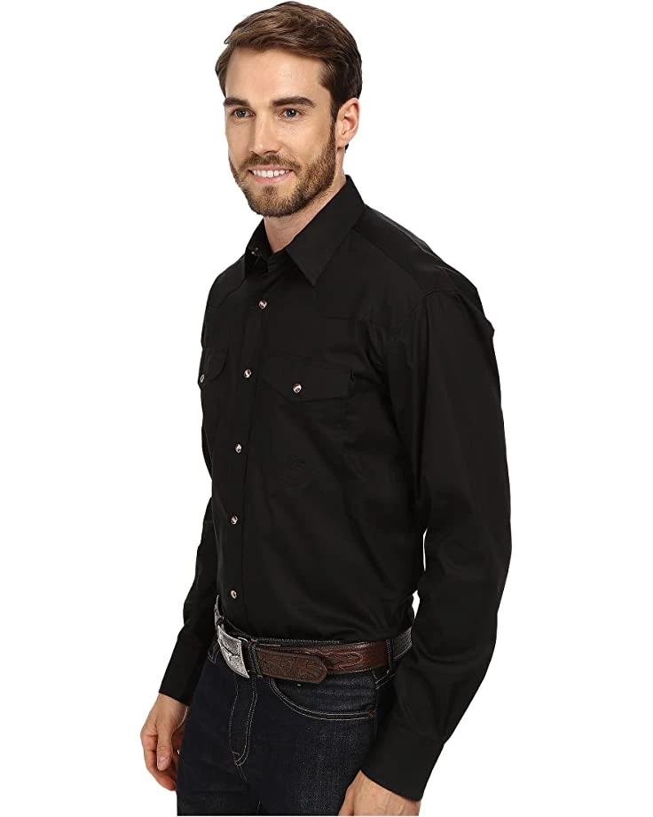 Fits well, style, modern subtle western styles. Dark black is what I wanted and it looks good. The cotton seemed not as soft as I expect. Washed without bleeding or fading. Dried with few wrinkles when taken out and hung right away. The fabric softened after wash. Wear with blue jeans and black jeans, dark black khakis. I like the snaps, which do hold closed well.