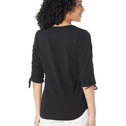 Roper Cotton Slub Jersey Knit Split V-Neck Top with Crewel Embroidery on Sleeves | Shirts & Tops