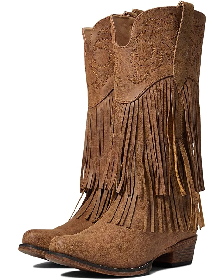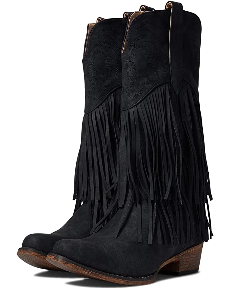 I’ve had the hardest time finding any boots to do line dancing. My skinny feet with bunions just seems to HURT in all of them… I’ve ordered a half size larger (8), added my orthotics and will wear comfy socks. The Roper Rickrack looks FUN with the fringe. I haven’t worn them YET so hopefully will be able to enjoy them!! I ordered black as I wear black pants often. I’ve got a wider toe box with a very narrow heel and the Roper doesn’t seem as tight in the toe box. I sure hope these are my dream pair of boots!!!!