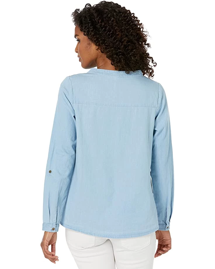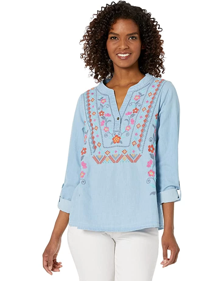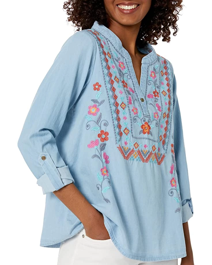2 reviews for Roper Split V-Neck Cotton Denim Shirt w/ Floral Crewel Embroidery | Shirts & Tops