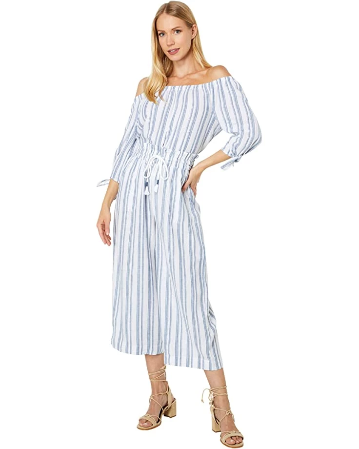 - Off-the-shoulder neckline and three-quarter length sleeves.